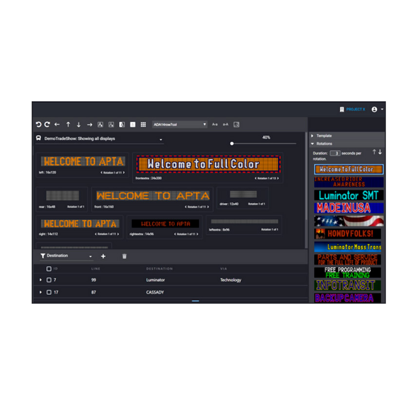 The destination editor feature allows users to set up bus and display configurations. Other functions within this feature include: importing existing projects, editing text and graphics, multiple areas with different fonts and display methods for static and scrolling, a preview of the bitmap, and exporting and deploying projects to an entire fleet.