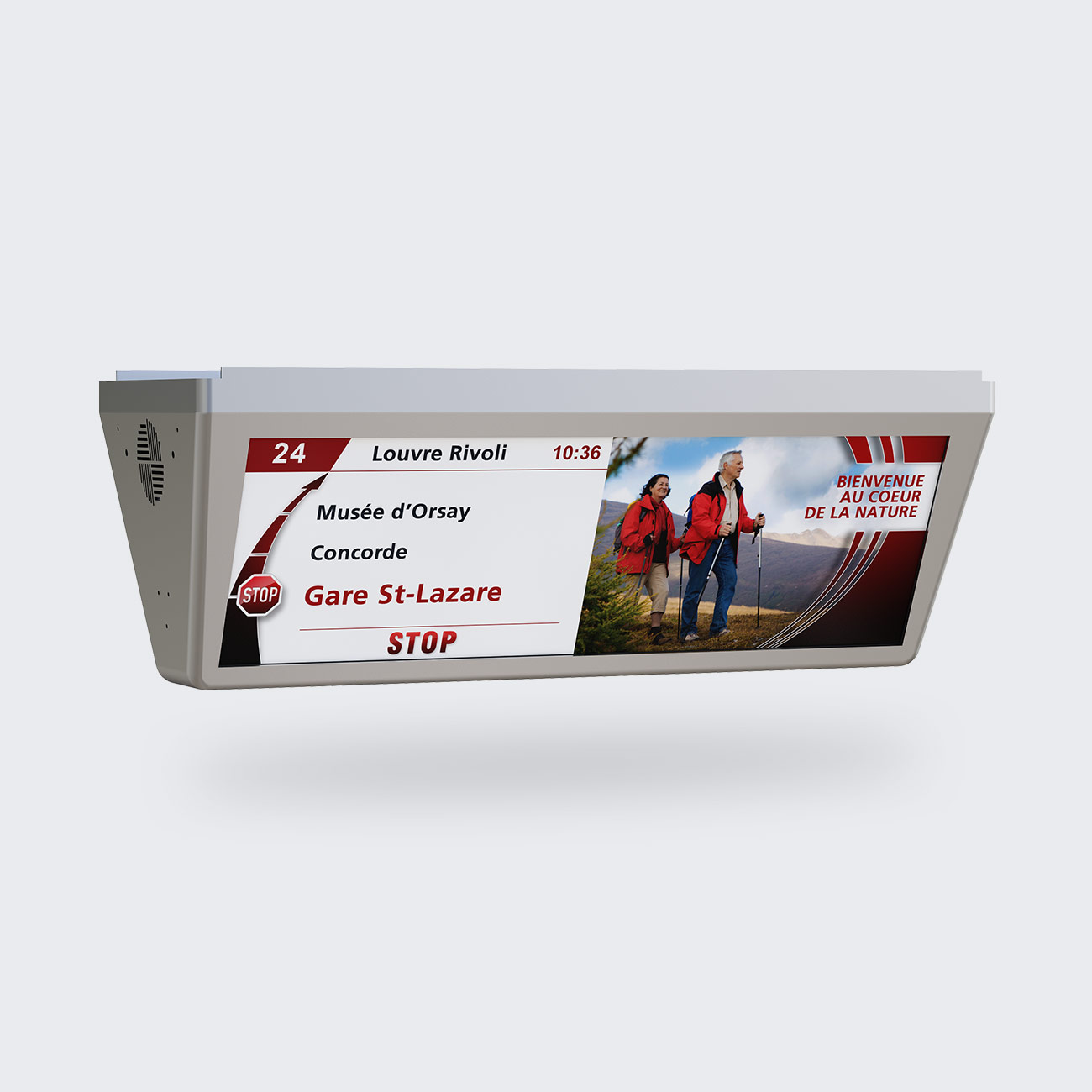 V-Design Infotainment es la pantalla LTG más instalada para trenes regionales. Es simple de operar y fácil de instalar. Ya sea que desee mostrar solo información del viaje o agregar otro contenido, la tecnología IPS proporciona un amplio ángulo de visión y la tecnología TFT con retroiluminación LED y resolución Full HD garantiza una visualización brillante de textos, gráficos, imágenes o videos (por ejemplo, mapas de red, símbolos para cambiar de tren, anuncios actuales o anuncios). El bajo consumo de energía ahorra electricidad y la pantalla protectora ESG garantiza la protección para el exigente funcionamiento diario. Como ve, siempre puede confiar en V-Design.